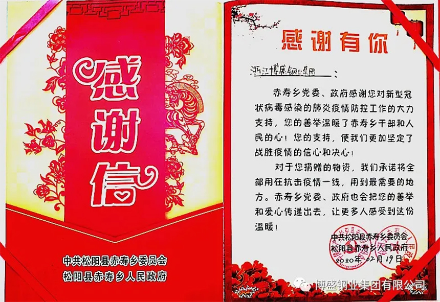 自新冠病毒肺炎疫情爆發(fā)以來,全國人民全力抗擊疫情。面對嚴(yán)峻的新冠病毒疫情,博盛鋼業(yè)集團(tuán)積極向松陽縣紅十字會捐贈5萬元及向赤壽鄉(xiāng)捐口罩500只。為共同抗擊承擔(dān)一份責(zé)任,愿盡綿薄之力,為社會盡一份力量。